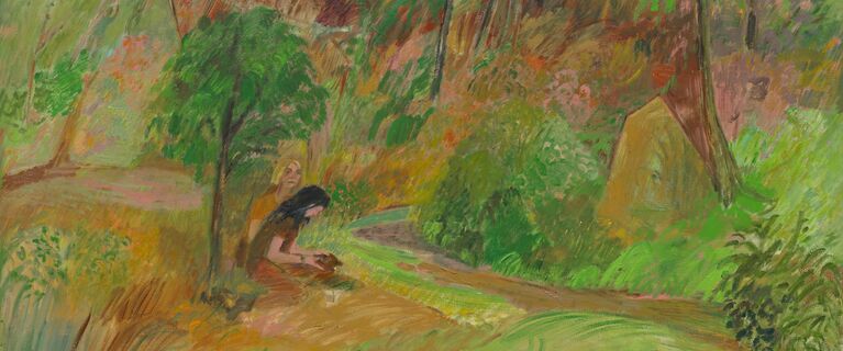 Hannah Brown lived in the countryside of western England until she turned 19, when she left to study sculpture at Central Saint Martins in London and later at the Royal College of Art. After a period spent making installation and text-based work, she took up landscape painting. The artist attributes her fascination with the genre—specifically, with vistas that study the psychological connections humans have with nature—to her bucolic upbringing. Her landscape paintings do not capture immense vistas, but rather the shadowy corners of nature; often, the viewer’s perspective is of someone peering out from the brush.