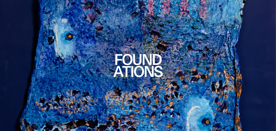 As part of Foundations, Ayedun presents her work with HOA, the São Paulo gallery founded by the artist during the COVID-19 pandemic. In And you know my wishes are sincere (2023), shades of deep blue ripple across the concrete surface, accented by soft gold powder. Infusing her oil paint and gold wax with a unique blend of pigments, Ayedun reimagines common materials in new and unexpected ways.
