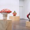 Sputniko!’s installation Red Silk of Fate (2021) is created using threads spun by silkworms genetically engineered to create oxytocin-infused silk. Long banners of red silk form a shrine-shaped roof that fills the gallery, with a circular halo of the titular red threads in the middle. The work refers to the East Asian belief that true lovers are bound by a red thread. This traditional line of thought is embodied by the shrine structure, but is challenged by the modern sensibilities of the short film Red Silk of Fate - Tamaki’s Crush, which plays alongside it. It’s a raucous, technologically fueled take on the shoujo genre of romance comics aimed at young women. In the video, a lovesick scientist engineers a “red silk of fate” to win over her male colleague, but doesn’t quite anticipate the potency of her creation.
