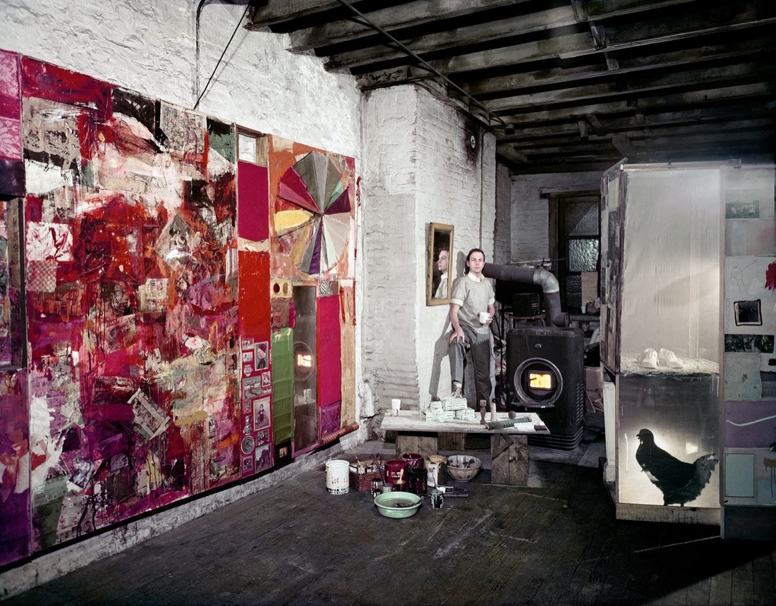 Rauschenberg in his Pearl Street studio, New York, March 1958. Works, left to right: Charlene, 1954, Untitled, c. 1954, and Monogram, 1955–59, second state, 1956–58. Photo by Dan Budnik. Courtesy of Robert Rauschenberg Foundation Archives, New York. © Dan Budnik, all rights reserved. Courtesy of the Museum of Modern Art.