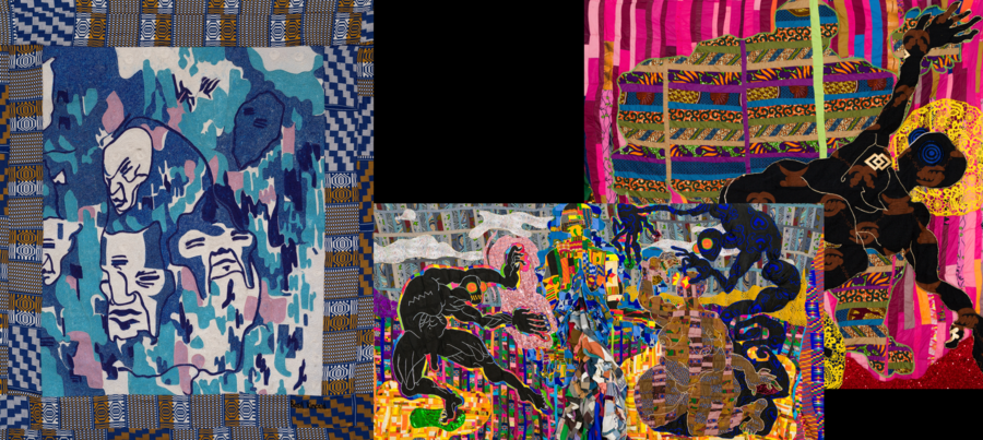 He splits his time now between St. Louis and Klagon, Ghana, where he opened a second studio in 2020. He hired production assistants to assist with sewing the quilts and with detail work for his “embroidery paintings,” a newer body of work that bridges the artist’s drawings and quilted pieces. These works visually recall the figures and faces in his quilts, while the embroidery traces similarly illustrated lines with added texture.