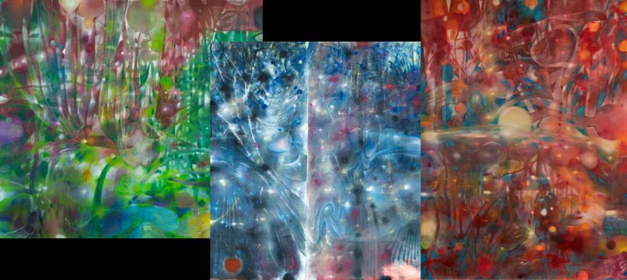 Take Adulterated Wind & Unmowed Grass (2023), for instance, where spectral strands twist and cling within thickened murky magenta, crimson, emerald, navy, and neon yellow hues. Sparkles of light emerge and cut through these translucent layers, unspooling the canvas in the throes of simultaneous motion and repression. Within the organic and aqueous, a distinctively human intensity is rendered, at once deeply personal and strangely enigmatic. These are the knotty, ensnared feelings that Li’s works evoke so acutely.