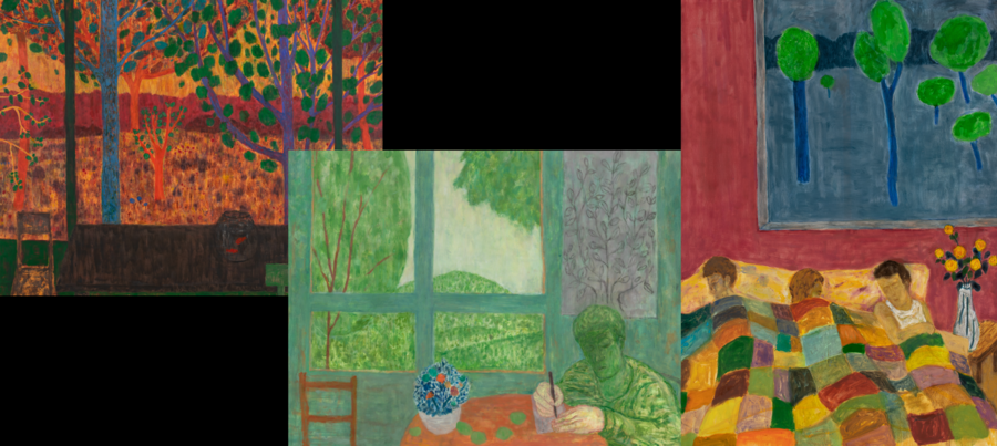 Bonnard often focused on domestic scenes that spill into the garden in his paintings—a frequent subject for Nakamura, too. For example, in SUMMER TABLE (2023), the artist creates an expansive, verdant background for a group of diners around a table, each lost in their own thoughts. In the foreground, vines poke up in front of their clouded faces—a sign, perhaps, of nature forcing its presence in the social world of human thought.