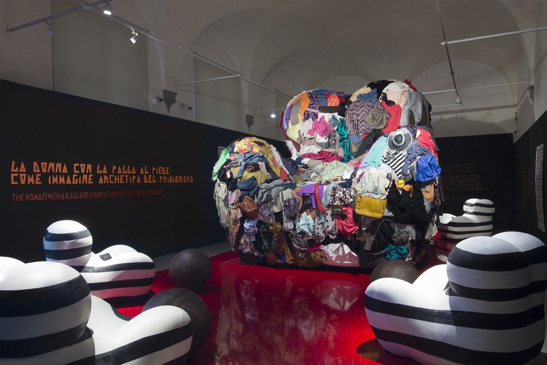 The Donna reemerged this winter as part of Pesce’s exhibition “Maestà Tradita” (Majesty Betrayed) at the Museo del Novecento in Florence, this time as a 13-foot-tall sculpture, covered in women’s clothing of different cultures and eras. The project aimed to draw attention to the economic and social injustice still experienced by over half the world’s population. It included an installation that invited visitors to dip a piece of bread into a bitter black liquid and eat it: Pesce’s attempt to demonstrate the bitter taste of women’s oppression.