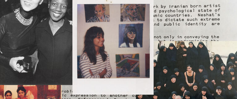 Header image, from left to right: Shirin Neshat with Thelma Golden at the opening of Neshat’s exhibition “Turbulent” at the Whitney Museum in 1998 (upper); Shirin Neshat at University of California, Berkeley circa 1979–80 (lower); Shirin Neshat at University of California, Berkeley circa 1979–80 (center); Shirin Neshat, “Untitled,” from Roja series, 2016. © Shirin Neshat (upper); Shirin Neshat with film extras for Rapture circa 2000 (lower); Press release from Franklin Furnace for Shirin Neshat’s “Unveiling,” in New York City,1993 (background). All images courtesy of the artist and Gladstone Gallery, New York and Brussels.