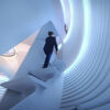 Such open, all-glass architecture is definitely an anomaly for the desert. A more inward-facing, stark-white aesthetic often prevails, including the Deserti Tascabili DJ Complex (2017) on the Tunisian island of Djerba, created by AutonomeForme of Palermo, Italy. The complex includes both a private house and facilities for an artistic residence program. Subtle design notes help occupants deal with the challenging climate, including terracotta in the roof that operates as “a breathing membrane, fostering natural insulation,” according to the firm’s founder, Marco Scarpinato. The structure is monastic in its simplicity, with all-white walls interrupted sporadically by the narrowest of windows. It’s meant to be a place of respite, with the site providing various zones that Scarpinato thinks of as “pocket deserts,” where visitors can “find peace, and retreat from the convulsive rhythms of modernity.”