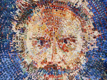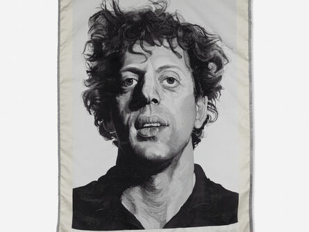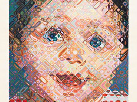 Over the course of a 40-year long friendship, Chuck Close has created numerous portraits of the composer Philip Glass. Most of the works are based on the same 1968 photograph of Glass, which Close says he has used “150 times or something,” executed in a variety of print techniques, including lithography, engraving, screenprint, and etching. This repeated engagement with the same photograph, an image Close is deeply familiar with, enables him to experiment with different stylistic techniques. Using his signature grid format, Close has depicted Glass through crosshatching, abstract patches of color, and even his own fingerprints. In 2005, Glass returned the favor to his longtime friend, with the premiere of a piano piece titled A Musical Portrait of Chuck Close.