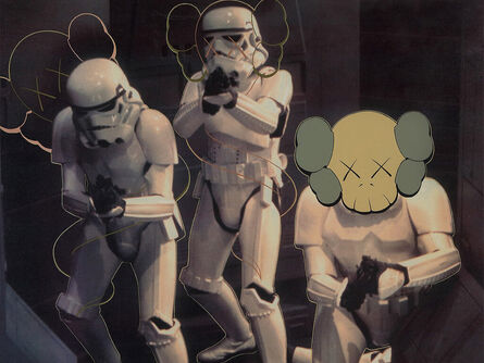 Inspired by the birth of his first daughter in 2014, KAWS invented a new pose for his signature Companion characters, Clean Slate. In Clean Slate, a parental Companion strides forward while carrying two smaller figures in its arms. “Even though I use a comic language, my figures are not always reflecting the idealistic cartoon view that I grew up on,” the artist explained. “Companion is more real in dealing with contemporary human circumstances. I think when I’m making work it also often mirrors what’s going on with me at that time.” KAWS debuted a 23-foot-tall version of Clean Slate in Hong Kong’s Harbour City in 2014, which was later exhibited in Shanghai’s Times Square in 2015 as well as the Modern Art Museum of Fort Worth in 2016–17. In 2018, the sculpture broke the artist’s auction record at the time, reaching nearly $2 million at Phillips. Later that year, the street artist transformed the monumental sculpture into 14-inch-tall collectible vinyl toys produced in an open edition and available in three distinct colorways—gray, black, and brown.