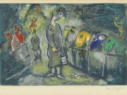 “A circus is disturbing. It is profound,” Marc Chagall wrote in 1966. “A timeless dancing game where tears and smiles, the play of arms and legs take the form of a great art.” Chagall’s fascination with the circus began at a young age when he saw traveling acrobats perform at village fairs in his hometown of Vitebsk, Russia. After moving to Paris, Chagall began working with the prominent art dealer Ambroise Vollard, who also cherished the circus (and whose clients included many leading talents of the time such as Pablo Picasso and Vincent van Gogh). In 1927, Vollard asked Chagall to create a suite of gouache paintings about the circus, giving the artist full access to sketch the flying acrobats and gaudy costumes from his personal box at the Cirque d’Hiver in Paris. In 1962, Chagall returned to these early paintings and transformed them into 23 color and 15 black-and-white lithographs, capturing the wild pandemonium of the circus with a painterly printmaking technique.