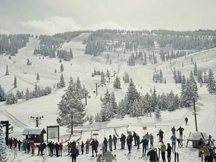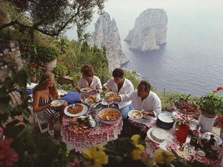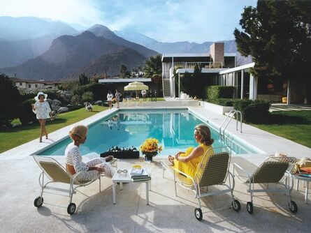 Poolside Gossip is Slim Aarons’s iconic 1970 photograph of California society women enjoying a leisurely day by the pool. In the foreground, two women are locked in conversation by a sparkling turquoise swimming pool, cocktails in hand, overlooking a few leggy friends and the idyllic purple mountains of Palm Springs. The snapshot has become an instantly recognizable motif—an emblem of modern, monied American culture in the ’70s. The photograph is available in several printed-to-order sizes in an edition of 150, but it can also be found as non-editioned posters and prints issued by the artist’s estate. In 2015, the photograph made waves in the news when two of the women featured in the original shot sat to recreate the iconic image—45 years later.