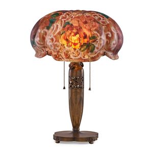 interior painted glass, patinated metal, with acid-etched mark 'the pairpoint corp' on interior of shade, base stamped 'pairpoint d3024 made in usa' on underside