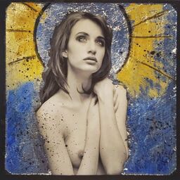 In an Instant: Iconographs is an exhibition of manipulated instant photographs. Drawing from Byzantine iconography, the female figure is reimagined as a spiritual subject. The images are then reworked using ink, paint, silver and gold leaf.