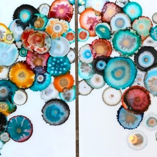 These ink and resin Geode Paintings are meditative works and, as a result, they appear organic in nature. Many different things can be seen in them such as agates, science experiments, human cells, or orbs.