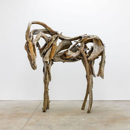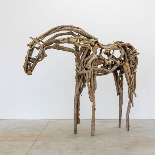 13th exhibition at Greg Kucera Gallery of new sculpture by Deborah Butterfield. This is a diverse collection; small sculptures have delicate lines and larger pieces incorporate thick sticks and muscular looking chunks of wood, all cast in bronze.