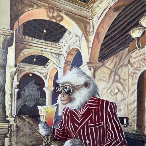 "Serge Strosberg: Monkey Business in Palm Beach" reinterprets Johnnie Brown, the beloved pet monkey of architect Addison Mizner, who famously ran for mayor. Strosberg’s meticulous works capture the essence of Palm Beach’s history, blending wit with historical significance.