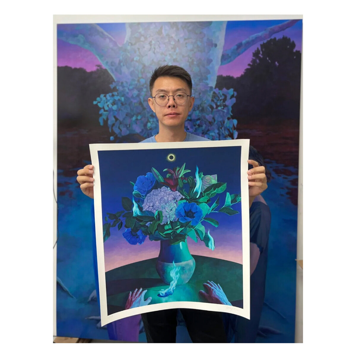 Xiao Wang is a Chinese painter based in Brooklyn, NY. He earned his BFA from the Glasgow School of Art and his MFA from the San Francisco Art Institute. Known for his deep, iridescent color palettes and moody atmospheres, Wang blends classical figuration with contemporary techniques, layering abstracted figures against flat planes of vivid, realist natural forms. His work engages personal and social themes, creating striking contrasts of light, color, and form.