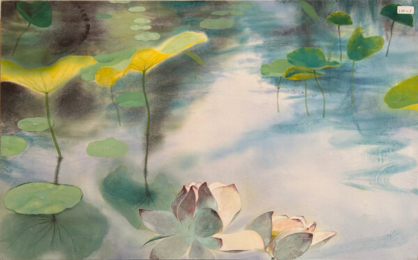 In The Weight of Water, lotus blooms and leaves drift gently across a luminous surface. Their reflections ripple below, revealing the quiet presence of water as both support and space. The painting invites calm observation, where stillness feels as deep as gravity.