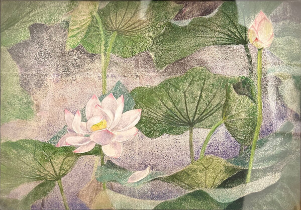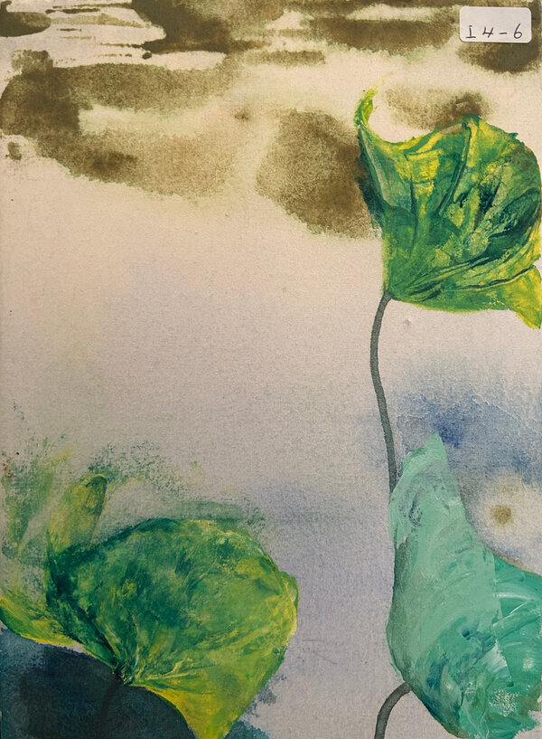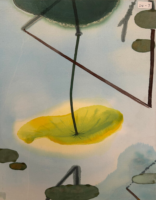 In Flying Consultation, three lotus leaves appear to converse mid-motion—curving, tilting, and rising as if caught in a gentle dialogue with the wind. With its graceful forms and layered washes, the piece captures a fleeting harmony between movement, nature, and silent understanding.