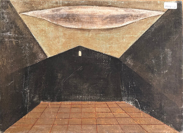 In "Black Earth," Kenta Morooka uses mineral pigments to depict a minimal yet resonant architectural landscape. The dark structure and gridded floor suggest a quiet tension between nature and human-made space. Through muted tones and delicate surface textures, Morooka continues his exploration of material and perception.