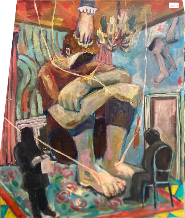 In Laboratory, Kenta Morooka constructs a surreal interior where distorted human figures and symbolic gestures intertwine. The layered brushstrokes and vivid palette convey a tension between control and chaos, inviting viewers to explore subconscious narratives within contemporary Japanese art.