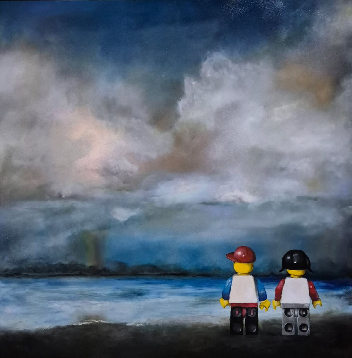 I seek to explore the intersection of nostalgia, imagination, and the emotional landscapes we carry with us into adulthood. These paintings juxtapose the stark, awe-inspiring beauty of nature—a turbulent sky, a vast horizon, an idyllic seascape—with the iconic, simplified forms of LEGO figures. These figures, often symbolic of childhood innocence and creativity, are placed in contemplative positions, gazing out toward the unknown.
