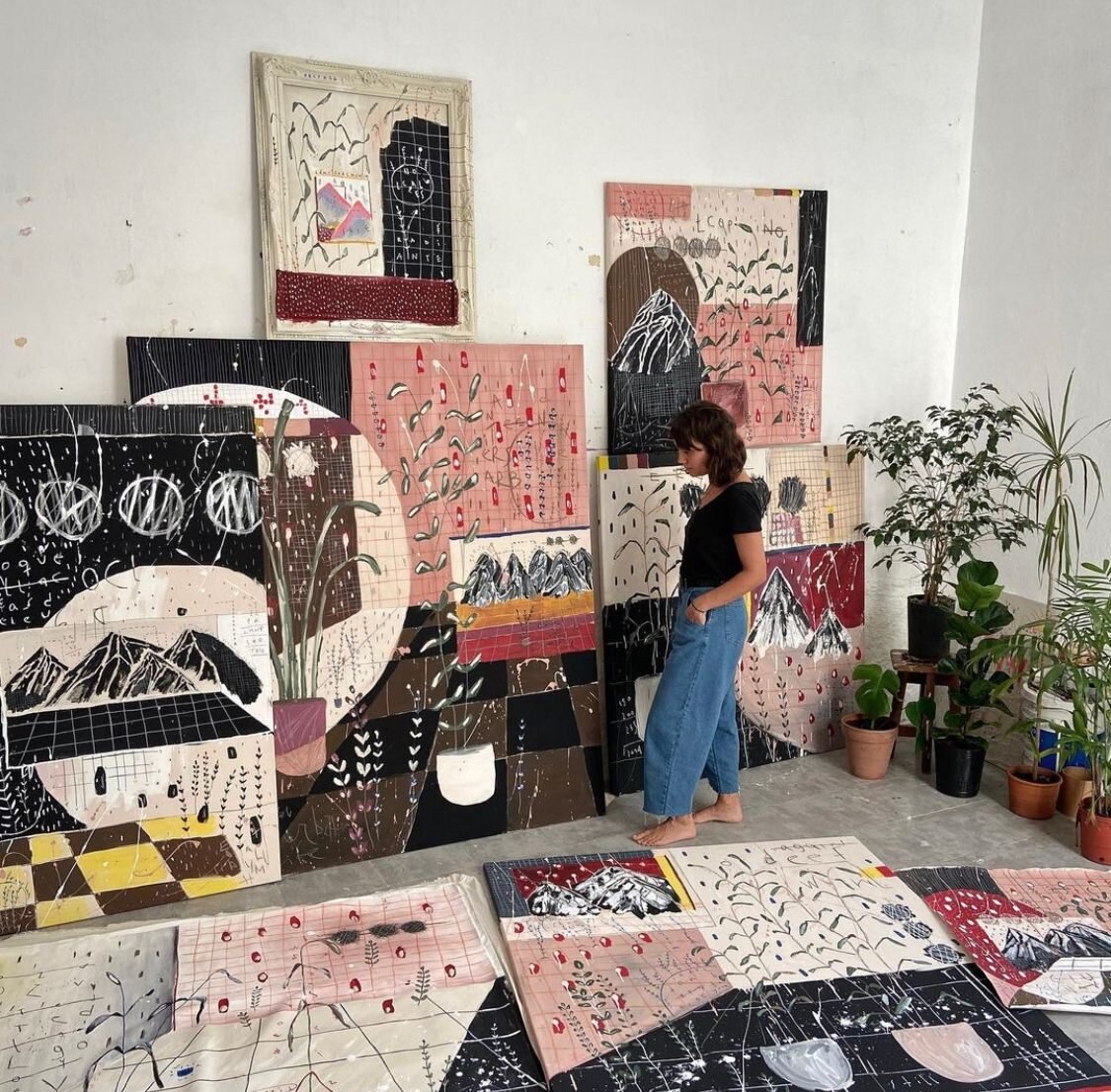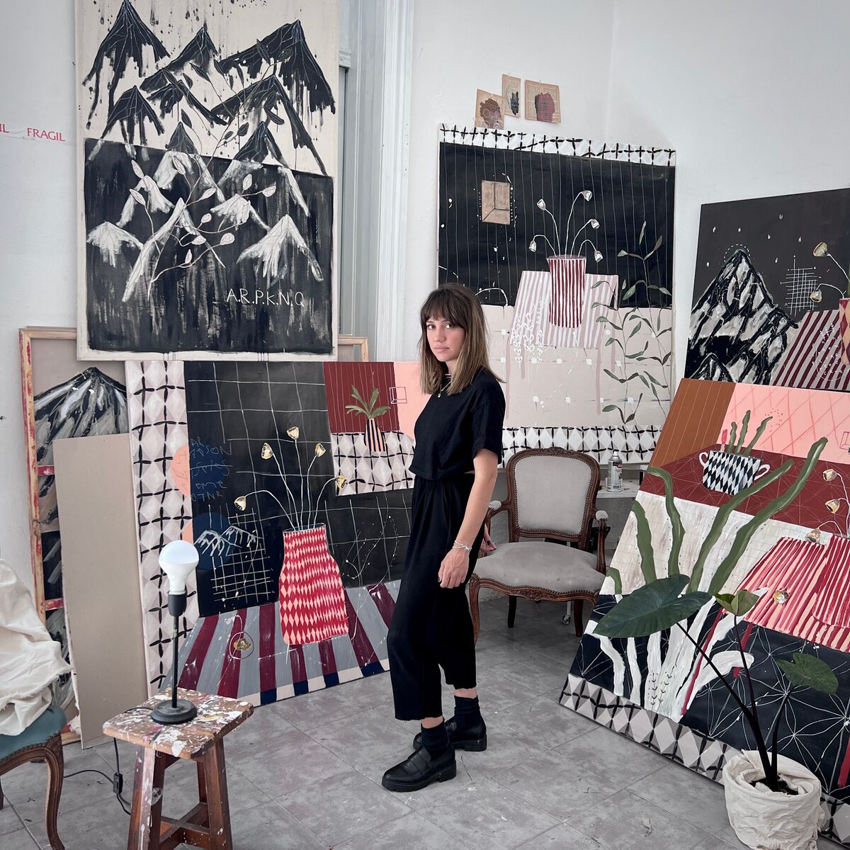 One of the recurring themes in Castiglia's paintings is the exploration of the relationship between the inside and the outside. Through her use of patterns, shapes, and colors, Flora deconstructs and rearranges familiar objects and places, blurring the boundaries between interior and exterior worlds. Her artistic vision transforms these spaces, creating an interdimensional realm where potted plants and mountains coexist harmoniously.