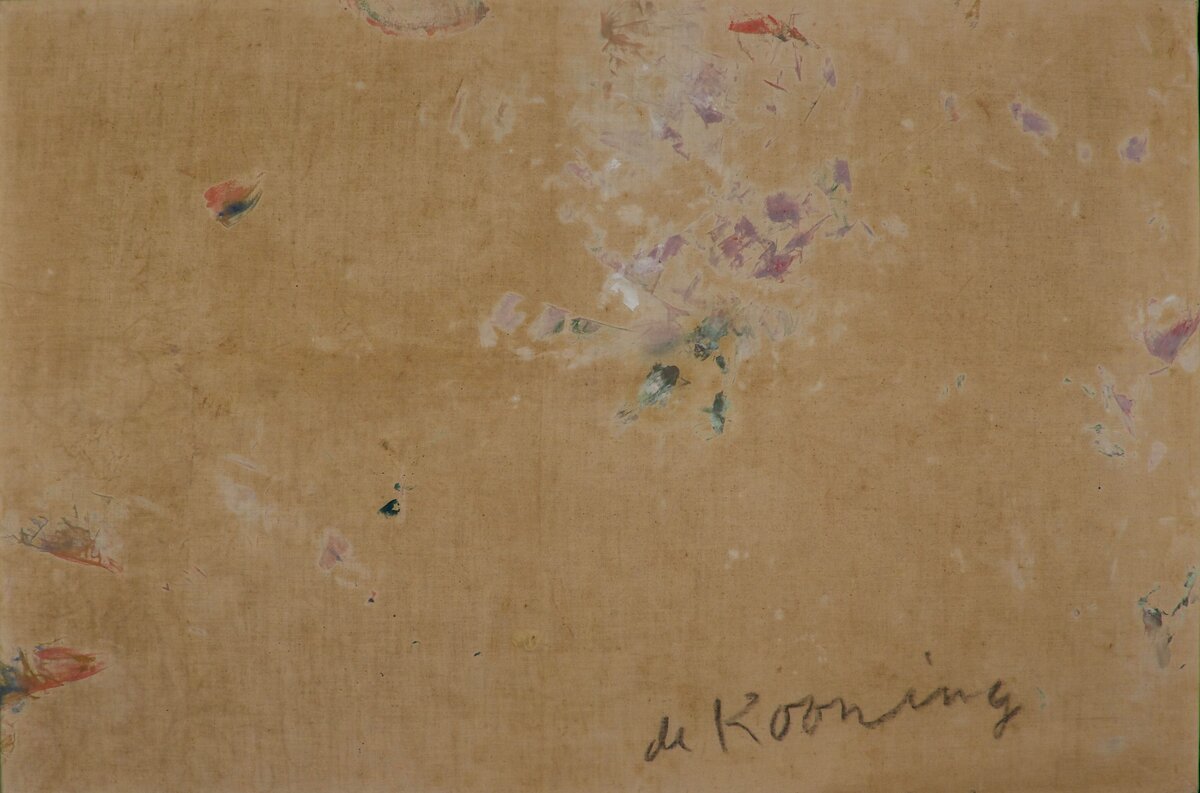 In this late-career work, de Kooning embraces subtlety and restraint. Flecks of soft color drift across raw linen, creating a sense of quiet movement and openness. The composition feels intimate, almost weightless, yet unmistakably his—anchored by a confident signature and decades of painterly instinct distilled into a whisper.