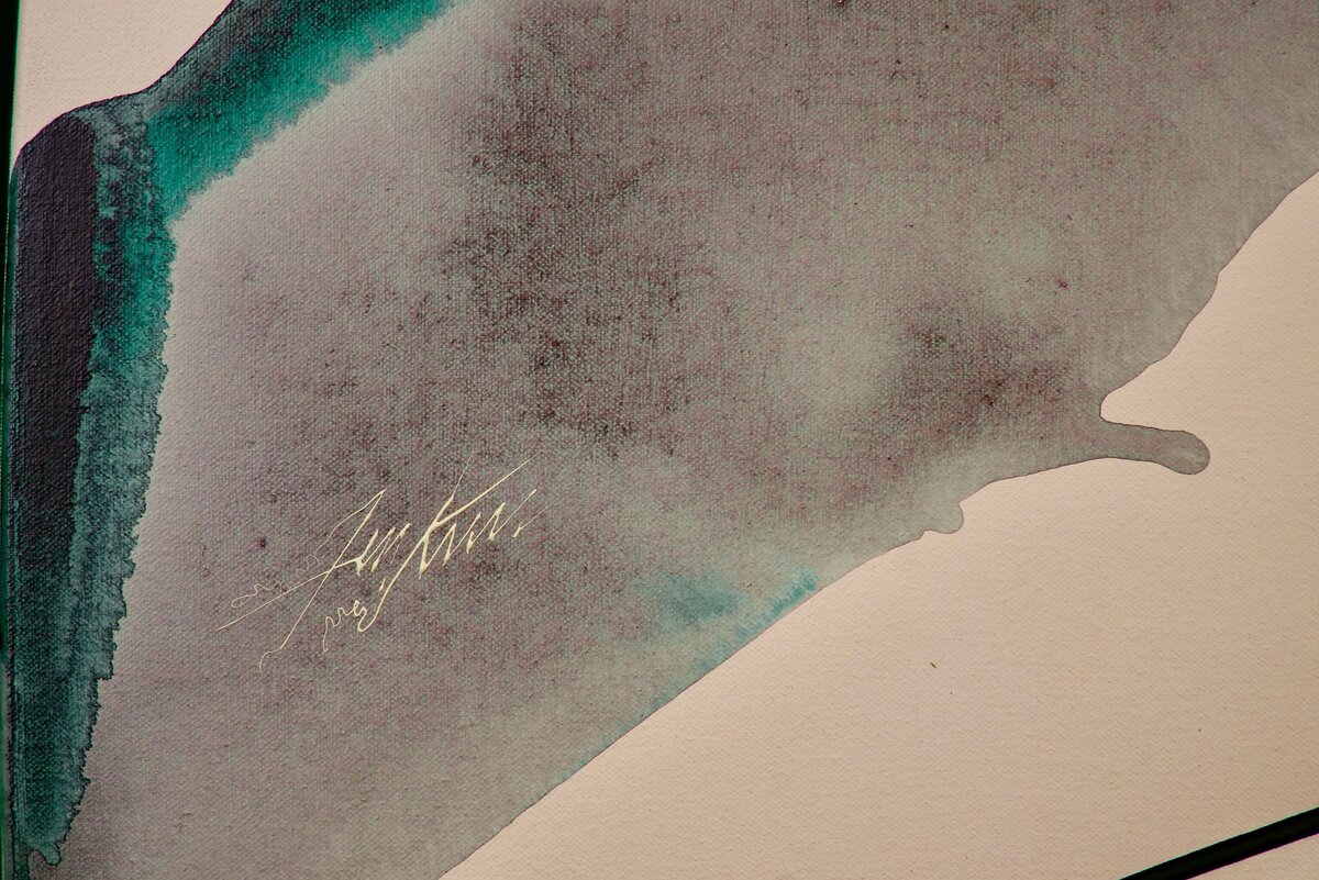 In Phenomena Cast, Jenkins orchestrates flowing veils of color with his trademark control and intuition. The painting’s energy culminates in his meticulously rendered signature—so precise and deliberate that it becomes part of the composition itself, a final flourish that echoes the discipline behind the apparent spontaneity.