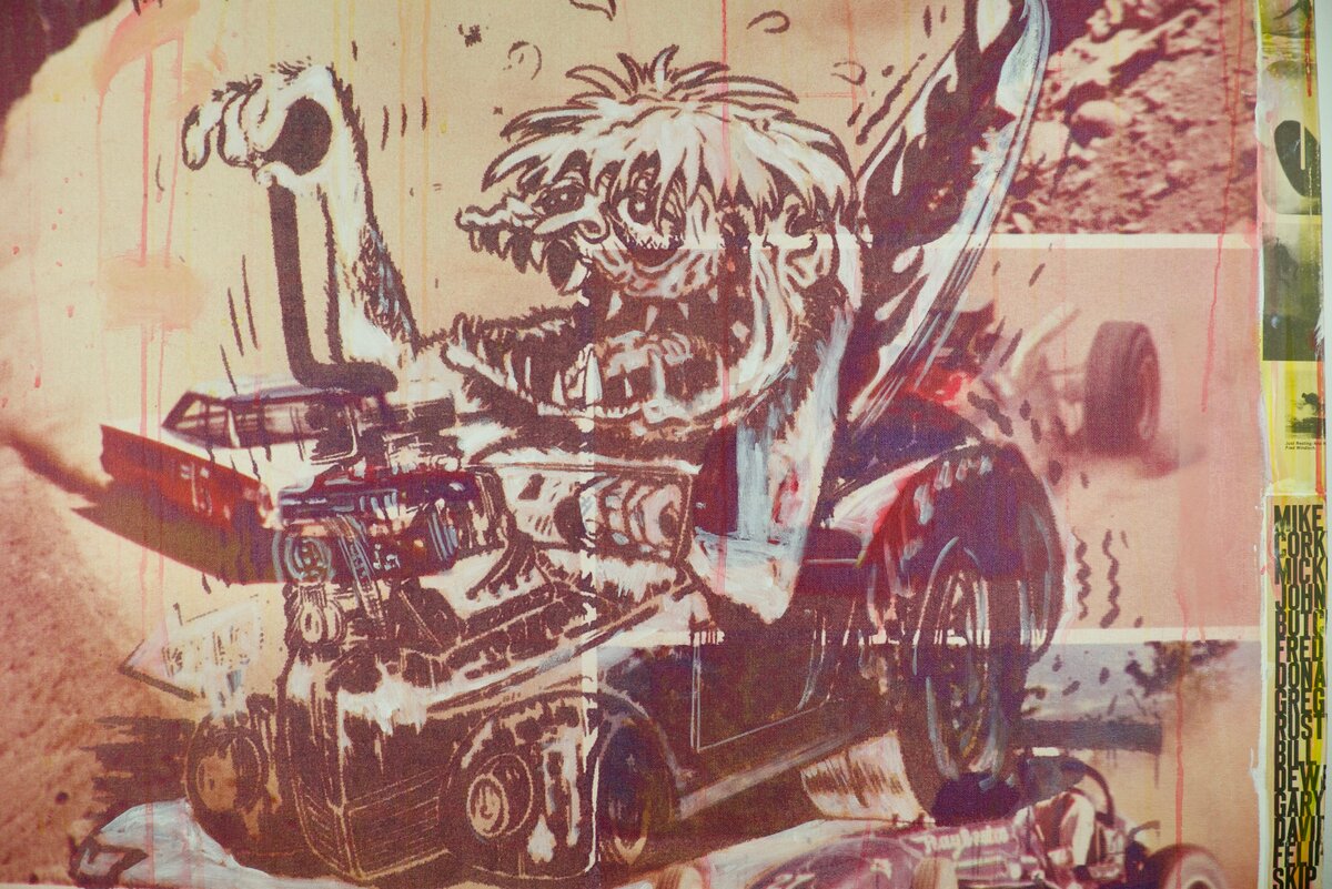 Tom dash fuses cartoon absurdity with vintage racing iconography. The wild-eyed monster driver—reminiscent of Rat Fink and underground comix—thrashes a souped-up dragster across a sun-bleached desert course. Rendered in painterly drips and pop-fueled collage, the scene captures a reckless, gleeful collision of Americana, speed culture, and manic desire.