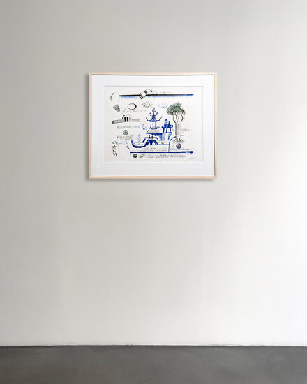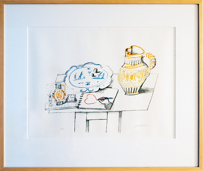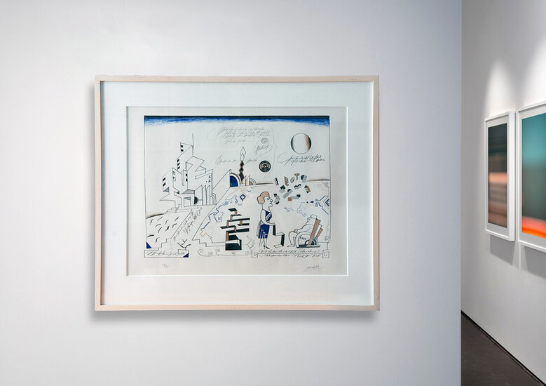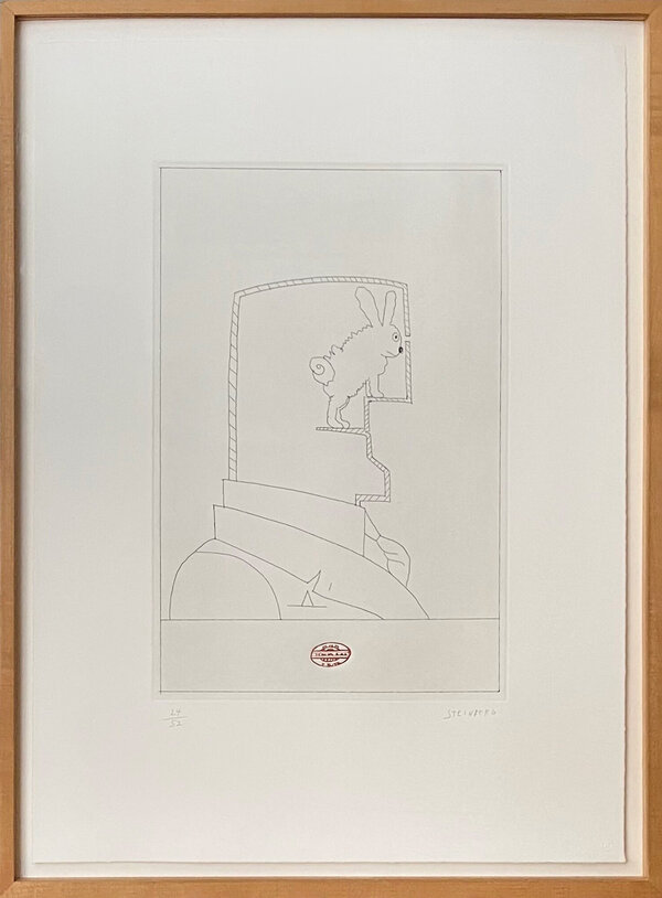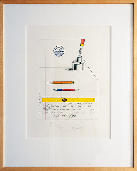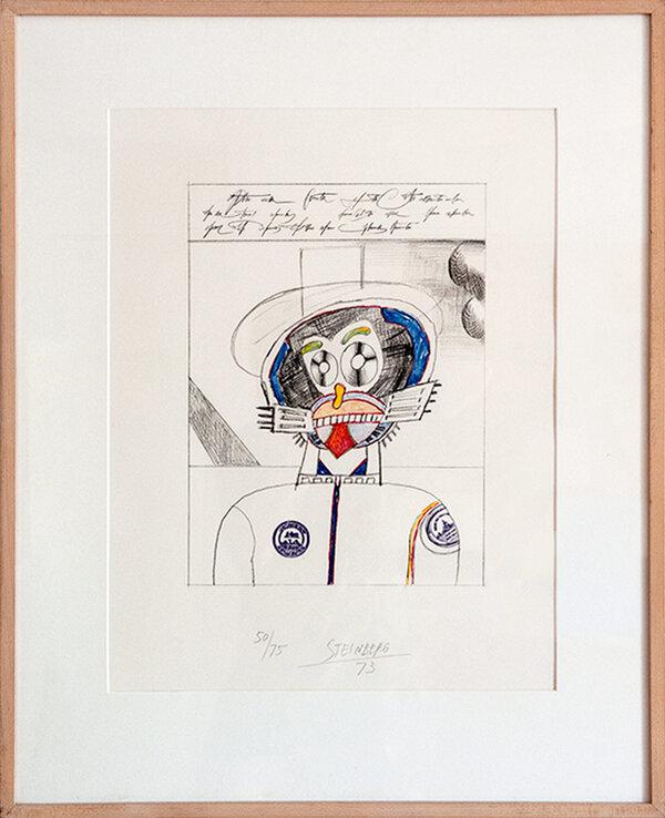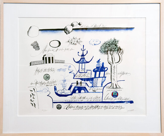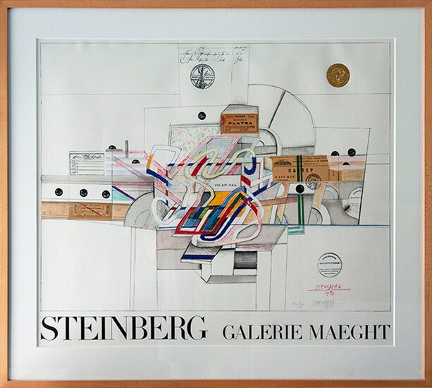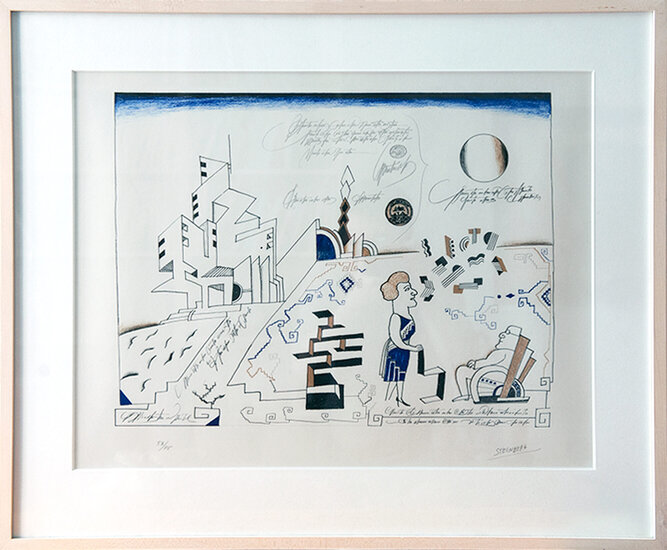 Saul Steinberg's "Papeterie" from 1973 is a color lithograph. It is known for its playful and whimsical style, often incorporating elements of high and low culture, and showcasing his signature line work and sense of humor. Steinberg's work, including "Papeterie," explores the human psyche and the absurdities of modern life.