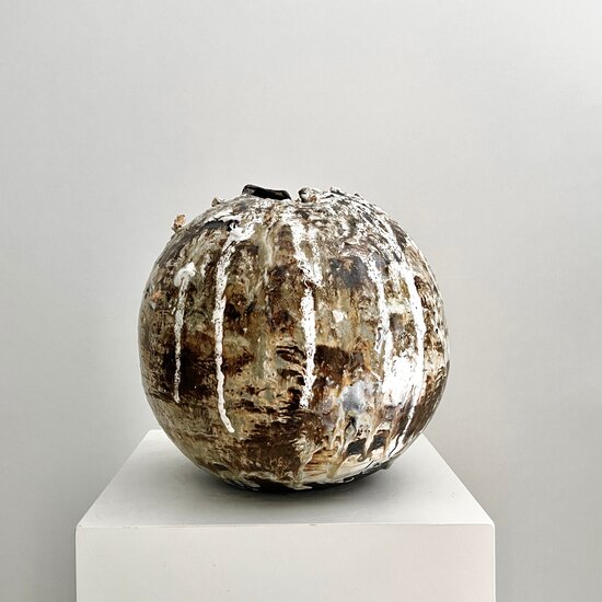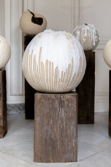 The construction of the sculpture demonstrates Laura’s dedication to durability and aesthetic integrity. Made from fine, resilient clay and fired at high temperatures, the spherical and oval ceramic elements form a cohesive structure that balances strength and fragility. The sculpture is designed for stability and solidity.