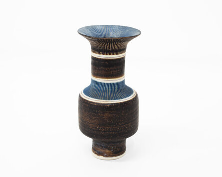 Rie made a conscious choice to move away from traditional British styles of pottery. Instead, the potter looked elsewhere, drawing from classical antiquity and examples of ancient Roman pottery in particular. Rie adopted the use of manganese glaze, effecting a radiance of golden or bronze hues on the surfaces of her pots. In other instances, she extended the necks of her vases and flared their tips as evocations of Byzantine works. During a visit to Avebury in the late 1940s, Rie encountered Bronze-Age vessels decorated with sgraffito, and subsequently began to experiment with the technique, adorning many of her works with similar rhythmical cadences of lines and metrical motifs.