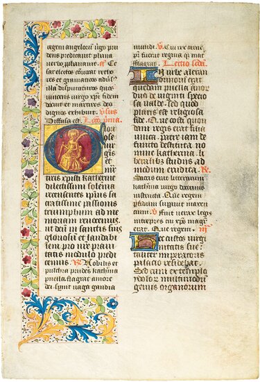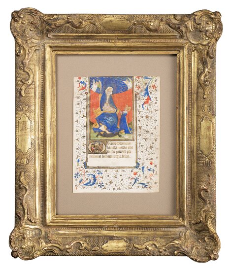 Early in his career, the Master of Jean Charpentier's style is closer to Jean Fouquet, evident in his more sophisticated brushstroke and elongated figures. During this period, he illuminated a remarkable copy of the Lamentation de Saint Bernard for the Duke of Nemours, Jacques d'Armagnac (now held in Paris, Bibliothèque nationale de France, ms. fr. 916). Toward the end of his career, the Master of Jean Charpentier's style evolved and became closer to that of Jean Bourdichon. In the 1480s and 1490s, he painted the Book of hours of Philippe de Commynes, a counselor and chamberlain to King Louis XI, which is now in the British Library in London (Harley 2863). According to scientific literature, the Breviary of Saint-Julien de Tours, from which our two illuminated leaves originate, dates back to around 1470-1475 and is considered the earliest known work of the Master of Jean Charpentier. The camaïeu technique for the painting of Saint Catherine is reminiscent of the historiated initials in the renowned Hours of Etienne de Chevalier by Jean Fouquet (most leaves are now at the Musée Condé in Chantilly). It is no surprise that our present Saint Catherine, whose quality nearly exceeds other works by the Master of Jean Charpentier, was initially thought to be by a follower of Jean Fouquet.