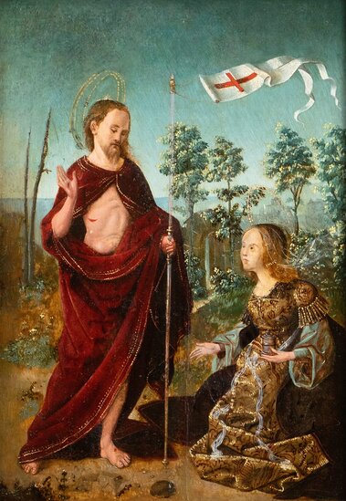 The present painting is executed by an anonymous Spanish painter and depicts the Noli me Tangere. It is faithfully based on the painting realized by Juan de Flandes for the Cathedral of Palencia between 1509 and his death in 1519. It is therefore most certain that the painter of the present Noli me Tangere was working during the first half of the 16th century, in Palencia, where he could admire Juan de Flandes' work. Some elements have been closely copied, such as the position of Christ and Mary Magdalene, or the presence of the city in the background. Other details have been simplified, such as the sky and the decoration on the clothes of the two figures. The painter of the present Noli Me Tangere has also taken a few liberties, such as adding a few trees on the right, or modifying the colors of Mary Magdalene's drapery.