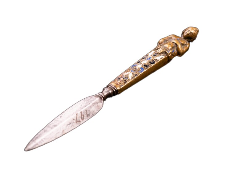 This delicate penknife (a small knife used to pierce food) features a remarkable handle adorned with champlevé enamel and topped with a beautiful Bust of Bacchus, identifiable by his attributes. Amusing details, such as the half-naked body, the grapes wrapping around his belly, or the clusters placed in front of his sex, convey the erotic character of Bacchus. As the god of pleasure, Bacchus is a popular motif in the iconography of the Dutch Golden Age, and the choice to crown the penknife with a Bust of Bacchus symbolizes joy and pleasure as well as prosperity and education, as mythological motifs were considered a sign of cultural refinement among the bourgeois and noble families of the 17th-century Netherlands. The artist who crafted the handle did not choose the representation by chance: the high society used such figurative cutlery during festivities. Moreover, the wear marks on the present penknife indicate an actual use, unlike the grand ceremonial cutlery. Stylistic study and the most convincing comparisons place the creation of the knife in the Netherlands during the second quarter of the 17th century. Comparable enameling is found on a few examples only, all of Dutch origin. Notably, the two enameled cutlery handles from the Jacques Hollander (1940-2004) collection: one is topped with a Drummer Girl and the other one features a Bust of a Bagpiper. It can therefore be assumed that this type of knife handles originates from a workshop in the Netherlands, especially since another knife handle (now in the V&A, London) and classified as Dutch c. 1630, is practically identical to ours. The presence of this handle seems to signal the existence of a model with a Bust of Bacchus then circulating in the Netherlands. On the blade of the present penknife, two valuable pieces information appear: the monogram "C" and the old inventory number "197". The monogram refers to the origin of the work and is generally a signature of a workshop, a family of blacksmiths or an individual blacksmith. The presence of this monogram is a quality criterion: only the guild members were entitled to their own monogram. The inventory number refers to the provenance of the present penknife and the historical cutlery collection of Achille Jubinal (1810-1875), important French medievalist and knight of the Legion of Honor who assembled an impressive eclectic collection. In 1873, Achille Jubinal's knife collection was lent and exhibited at the South Kensington Museum (predecessor of the V&A, London). The following year, the museum published a catalogue in which the present penknife was erroneously classified as Italian. The cutlery collection of Achille Jubinal was then privately kept in the same family for several generations before reappearing on the auction market, without having been identified as the former collection of Achille Jubinal.