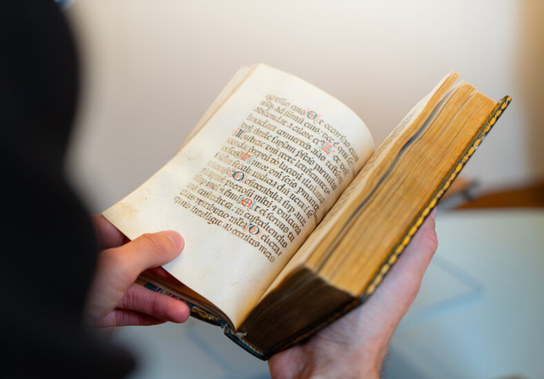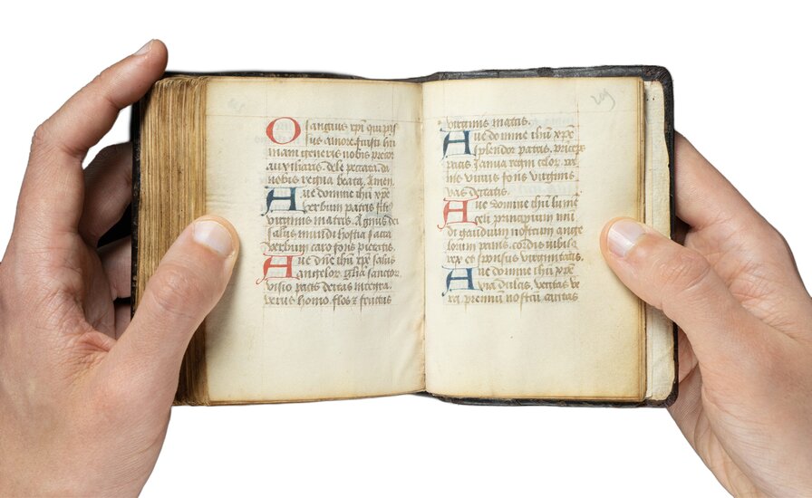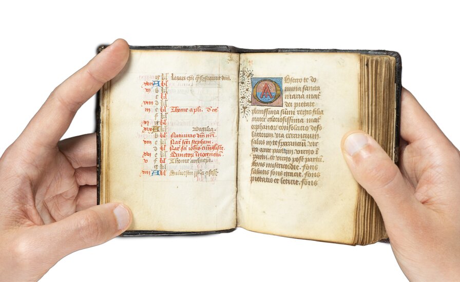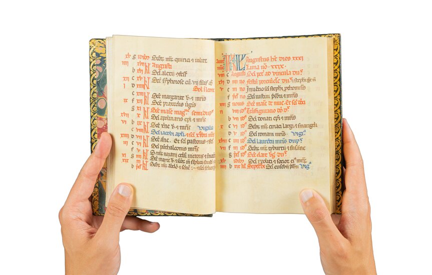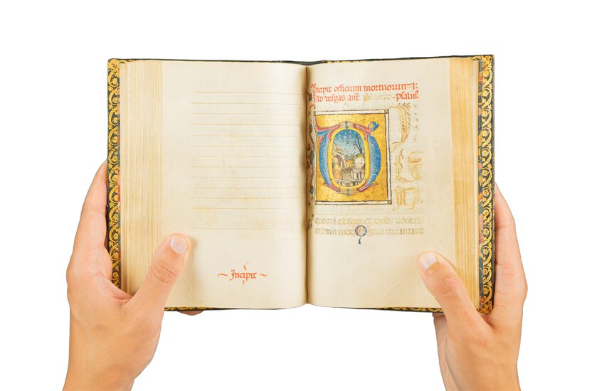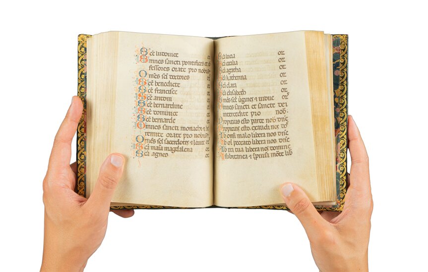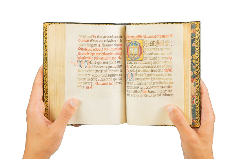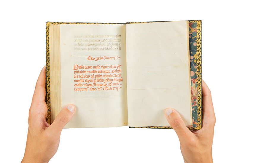 Complete, in remarkable condition, and bound in a superb binding à la dentelle, this Book of Hours is a true treasure for several reasons. First, and this is exceptionally rare, it contains the signature of its scribe: "per fr[atr]em Joh[an]em Francigen[is] ordi[ni]s mi[n]or[um]" (by brother John of France, of the Order of Friars Minor), as well as the date of completion, March 5, 1494 ("anno do[mini] M° CCCC° LXXXXIIIJ°. Die Va Martij"). Furthermore, this beautiful Book of Hours contains a unique series of prayers written in Italian, revealing a highly personalized character, likely intended of a patron.ess attached to the Franciscan movement. This trend in late 15th century Italy reflects the growing role of Franciscans as spiritual advisors for laypeople. Finally, the Book of Hours is characterized by a simple yet richly abundant decoration in liquid gold. The work of the scribe, extremely delicate, seems almost to surpass that of the illuminator, highlighting the spiritual rather than material importance of this manuscript.