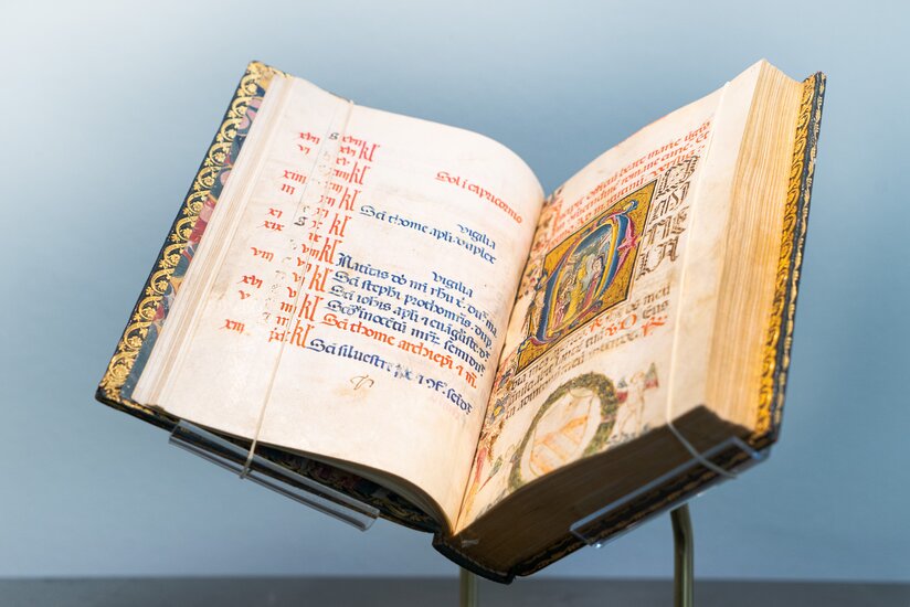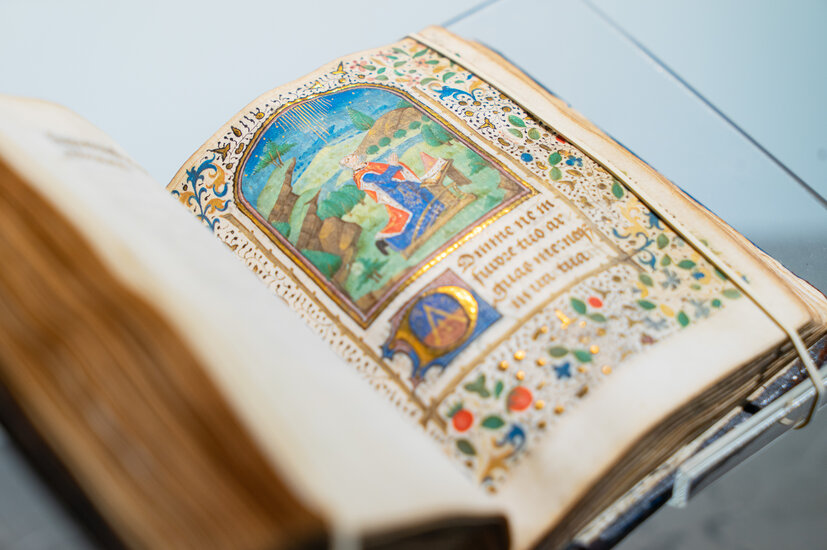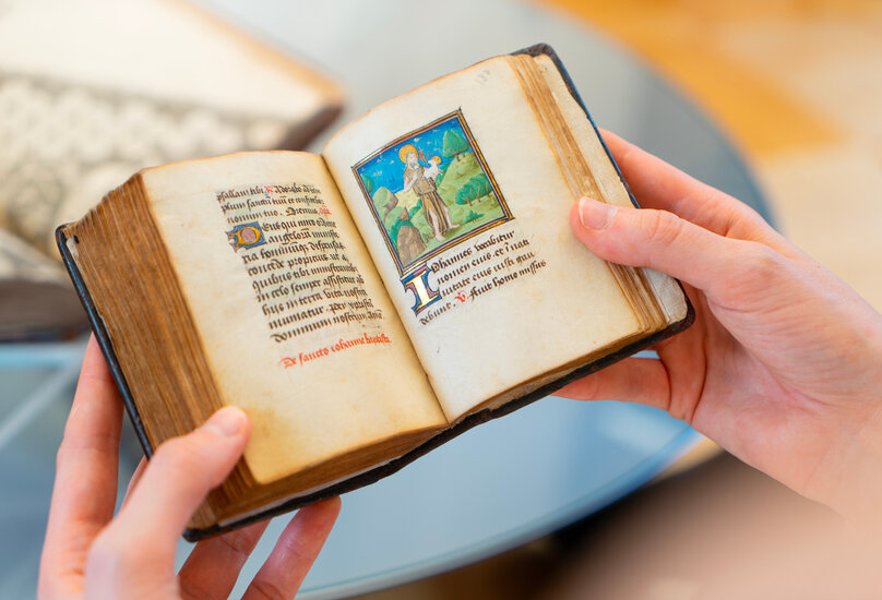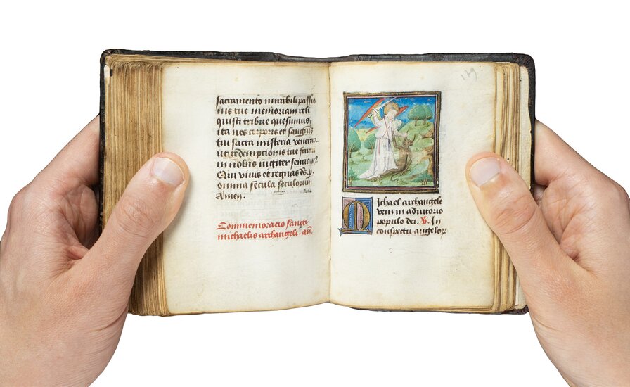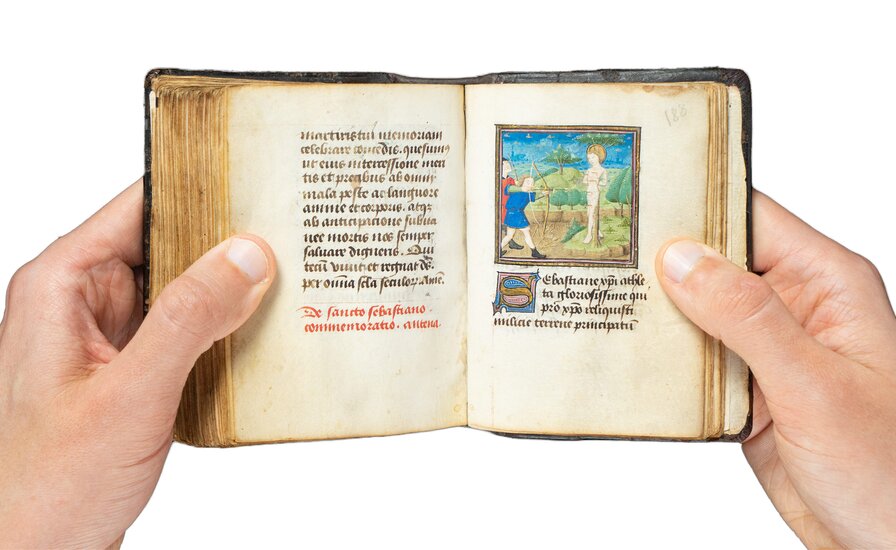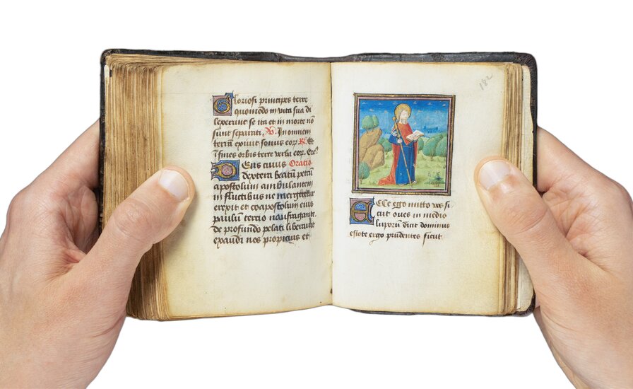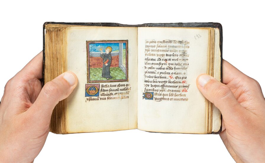 Book of Hours (use of Besançon); illuminated manuscript on vellum; in Latin and French. 217 ff., preceded and followed by one paper leaf, incomplete; Gothic Bastarda, brown, red and blue ink, liquid gold; one column, ruled for 14 lines; 13 illuminations all by the Master of the Troyes Missal; 12 4-lines decorated initials, 10 3-lines decorated initials; 108 small 1-line decorated initials; 2 illuminated leaves with richly decorated borders on four sides; 11 leaves with small floral ornaments. Leather binding on wood, 16th century.