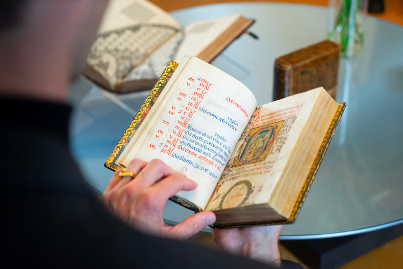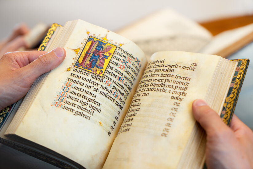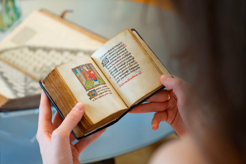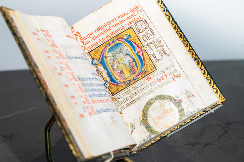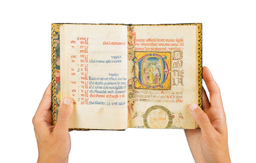 Book of Hours (use of Rome and Franciscan use), complete; illuminated manuscript on parchment; in Latin and Italian. 142 ff., preceded by two parchment leaves, added, preceded and followed by two paper leaves; calligraphy Littera rotunda, black, brown, blue and red ink, liquid gold; one column, ruled for 15 lines; 8 illuminations, 5 folios with small marginal decorations. Italian binding in green morocco à la dentelle , 19th century.