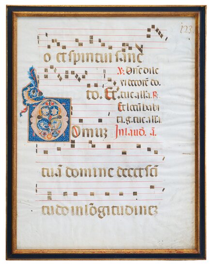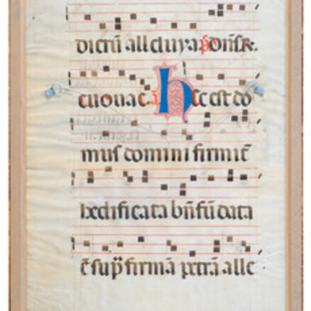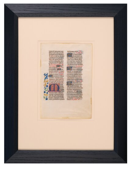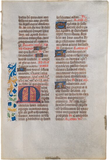 This large, decorated leaf comes from the fifth volume (out of nine) of an antiphonary made for the church of San Domenico in Perugia circa 1320 by the workshop of Marino da Perugia alongside a four-volumes gradual and a sequentiary. Thirteen (out of fourteen) of these volumes are today preserved in the Bibliotheca Comunal Augusta in Perugia while the fifth volume, which was still in the church of San Domenico in Perugia during the 15th century, was dismembered at an unknown date. From this volume, four leaves are currently known (see sister leaves below). Our leave, unknown to date, comes from this same manuscript. The large initial "D" (measuring 170 x 115 mm) is richly decorated with beautiful floral ornaments, bursting with colors, on a deep blue background with delicate white rinceaux. The verso shows the initial "H" painted with deep blue and decorated with red and dark blue Gothic ornaments.