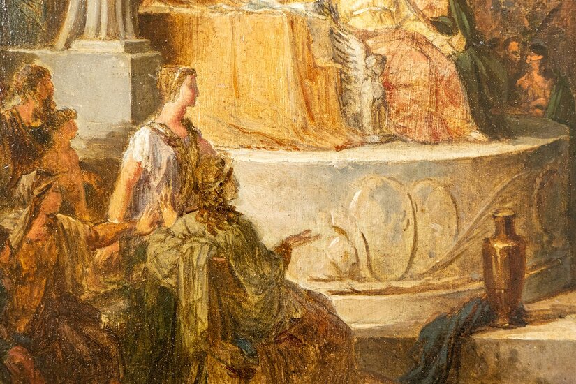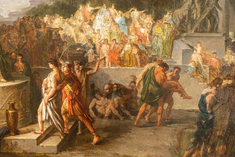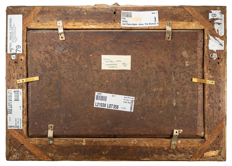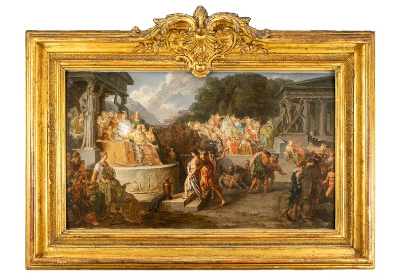Swiss artist Jean-Pierre Saint-Ours (Geneva, 1752-Geneva, 1809) realized this sketch as a preparatory painting for the Coronation of the winner (collection des Hôpitaux Universitaires de Genève, HUG). Mounted in a late 18th century or early 19th century beautiful frame that was adjusted to match the painting's size, the present panel is published in Jean-Pierre Saint-Ours' Catalogue raisonné and dated from 1807. This artwork is one of the very last paintings made by the artist, who died two years after. Thanks to a lithography of the present sketch made by Jules Hébert now in the Musée d'art et d'histoire de Genève, we know that the painting was in the collection of John Revilliod (director of the Banque du commerce, Geneva) in 1860.