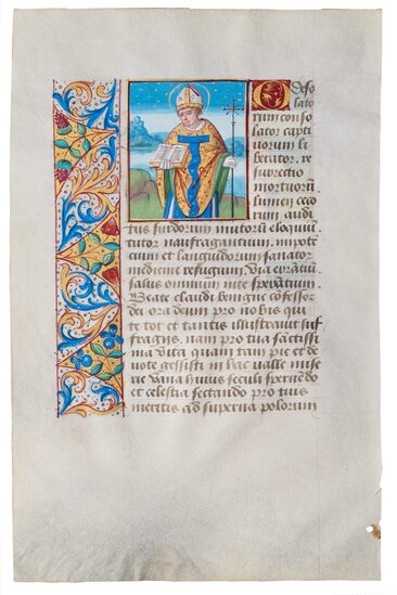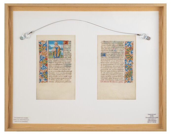 At the end of the 15th century and the beginning of the 16th century, Lyon became a major center for book production in France, rivaling Paris and Tours. This prominence was due to the growing interest of an aristocratic and merchant clientele, attracted by the city's advantageous geographical location and the importance of its fairs. To meet this increased demand, several illuminator workshops were established in Lyon, including those of the Master of Guillaume Lambert, Guillaume Leroy and the Master of the Entry of Francis the 1st, now identified as Jean Pingault. The Master of the Entry of Francis the 1st, named after a sumptuous manuscript depicting the Royal Entry of Francis the 1st in Lyon in 1515, preserved in Wolfenbüttel (Herzog August Bibliothek, Cod. Extr. 86, 4), has been identified with Jean Pingault by manuscripts expert Elizabeth Burin. Jean Pingault, who is documented in the archives regarding the entry of Francis the 1st in Lyon, is an important scribe and illuminator in the history of Lyon illumination and particularly prolific. His works include the Missal of Charles Alaman de La Roche Echinard in London (Library of the Order of Saint John), the Pontifical of Louis Guillart d'Epichelière at the Bibliothèque nationale de France (ms. lat. 955), and a Book of Hours for the use of Geneva made for Philibert de Viry (now in the Bibliothèque de Genève, ms. lat. 367). Expert Titana Levy has suggested identifying the Master of the Entry of Francis the 1st with Jean Ramel, a painter of Lyon, but this hypothesis has not gained wide acceptance. Jean Pingault is recognized for his rapid and lively style, using a diluted application of paint with a vivid palette dominated by cool tones, and his figures display calm expressions. The three small illuminations of our two leaves faithfully reflect this artist's style, including amusing elements like the domesticated pig alongside Saint Anthony, echoing his nickname "Saint Anthony of the Pigs", and an atypical depiction of Saint Nicholas as a bishop rather than a pope. Our two illuminated leaves come from a Book of Hours, from which we have been able to locate other leaves: one is held at the University of Florida, and three others are in private hands in the United States. We have identified the six calendar pages from the same Book of Hours, formerly in the collection of Ernst Boehlen (Switzerland). These leaves, recently put on the market, reveal a stamped coat of arms on the January folio, thus indicating a previous owner of our leaves, and of the Book of Hours still complete.