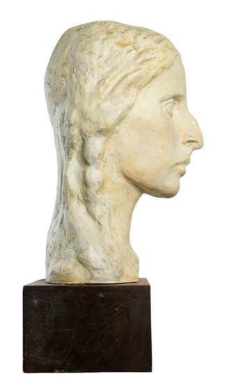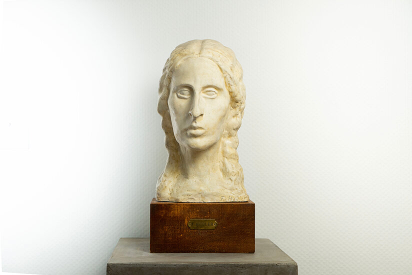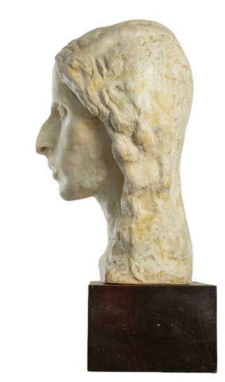 From 1914 to 1915, during the illness of his companion Valentine Godé-Darel (1873-1915), Ferdinand Hodler created a poignant series of oil paintings capturing her phyiscal decline, and most of these paintings are now preserved in museums in Switzerland. In addition, at the beginning of 1914, Ferdinand Hodler created three plaster sculptures representing the bust of his companion. Like the paintings, these sculptures reflect Ferdinand Hodler's deep emotion connection with his companion, but they also reveal the lesser-known side of Ferdinand Hodler as a sculptor. Despite having won a first prize in sculpture at the age of twenty, the Swiss artist's sculptural production is extremely sparse and rare. At the beginning of the 20th century, it was believed that only one sculpture by the Swiss artist was known: an unsigned plaster Bust of Valentine Godé-Darel (now in the collection of the Musée Jenisch in Vevey). Subsequently, an unsigned plaster medal project representing William Tell (now at the Museum of Art and History in Geneva) was discovered, along with two other plaster busts of Valentine. One, also unsigned, is in private hands, while the other, recently rediscovered and which is signed, is the bust we present here.
