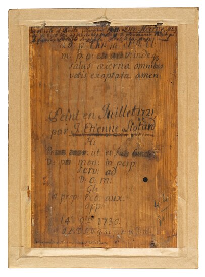 An emblematic figure in the history of art, Jean-Étienne Liotard was one of the most important artists of his time. After training briefly with Daniel Gardelle in Geneva, Jean-Étienne Liotard entered the studio of Jean-Baptiste Massé in Paris in 1723, where he began his apprenticeship. In the spring of 1736, he travelled to Rome, then, in 1738, to Constantinople, where he stayed until 1742, before moving on to Jassy and, in 1743, to Vienna, where he was noticed by the Empress, who hired him as court painter. After brief stays in Venice and Frankfurt, Jean-Étienne Liotard returned to Paris in 1746, where he remained until 1753. He then worked in London, The Hague and Amsterdam. In 1757, the painter returned to his native city with great renown, while continuing to exhibit his works abroad. After a final trip to Vienna in 1777 and a year in Lyon in 1781, Jean-Étienne Liotard settled in the Geneva countryside in 1782. The present portrait is one of the few works by Jean-Étienne Liotard that can be precisely dated to 1721, i.e. before his first trip, thanks to the autograph inscription on the reverse. This Portrait of Jean-Pierre du Maine (1685?-1748), pastor of Lausanne and Daillens, is one of the artist's earliest work, which gives it a remarkable documentary value, all the more so as it is the first documented signed and dated portrait produced in Geneva by Jean-Étienne Liotard.