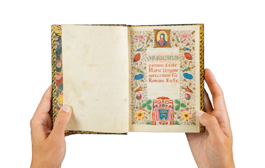 fol. II: 19th century frontispiece with unidentified coat of arms belonging to an Italian cardinal, illuminated borders on four sides and the Portrait of the Virgin in a medallion