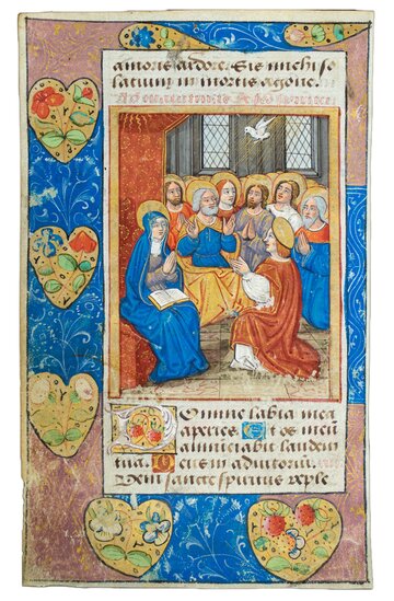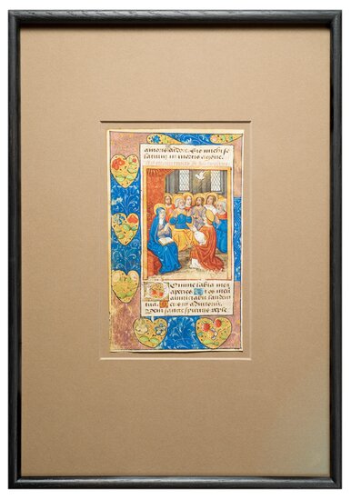 At the turn of the 15th to the 16th century, manuscripts began to disappear, supplanted by the printed books, which had been gaining popularity ever since the invention of the printing press, generally attributed to Gutenberg with the printing of the first Bible in Mainz in 1454. In France, starting 1490s-1500s, printed books became increasingly common, gradually eroding the tradition of (illuminated) manuscripts, which were more time-consuming and more expensive to produce. The present illuminated leaf, depicting the Pentecost, is a beautiful example of a French illumination dating from the time when illuminated manuscripts were gradually being replaced by printed books. Originating from a Book of Hours, this charming illuminated leaf shows all the characteristics of Parisian illumination from the early 16th century: the brushwork is quick, the contours are marked, the palette is diluted, the colors are particularly vivid and the profusion of decoration in the four borders is notable. This richness of colors and decorative elements in manuscripts from the early 16th century is often seen as the swan song of the illuminators, certainly aware that they were witnessing the last moments of their art. The artist responsible for this miniature is aligned with the style of the famous and prolific illuminator Étienne Colaud (active in Paris, first half of the 16th century), known thanks to his signature which appears in a Book of Hours (France, private collection). Several manuscripts, marked by Étienne Colaud's style, are work of collaborators, associates, or followers. Among these, we can mention the illuminator that expert Marie-Blanche Cousseau named "L'exécutant principal des Statuts" who illuminated several copies of the Statutes of the Order of Saint Michael produced during the reign of Francis the 1st. Our illuminator seems particularly close to this anonymous artist, but is probably another illuminator working in the same atelier. More specifically, we believe we recognize the hand of our artist in three other manuscripts, all indebted to the style developed by Étienne Colaud's workshop: a copy of the Institution du Prince (Paris, Bibliothèque de l'Arsenal, ms. 5103), a copy of Petrarch's Triumphs (Paris, Bibliothèque nationale de France, ms. fr. 12423) and a pontifical bearing the arms of Philippe de Lévis (Poitiers, Bibliothèque municipale, ms. 822).