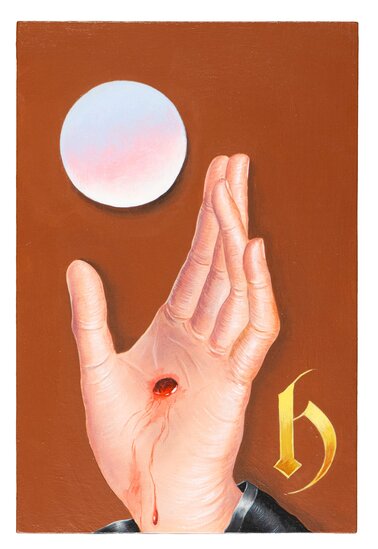 Coming straight from the artist's studio, the present painting encapsulates Harald Erath's thoughts on religion and symbolism. Removed from their original context, they invite reinterpretation. Elements like the hand with bloody hole or the moon (even the signature, which evokes a golden coat of arms) are free of any meanings; the viewer is free to assign his own meaning to the symbols depicted on the painting. For Harald Erath, the viewer's emotional response is always crucial, defining his art beyond his own intentions.