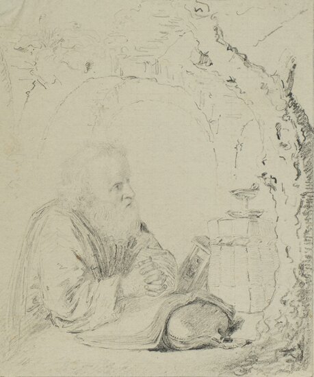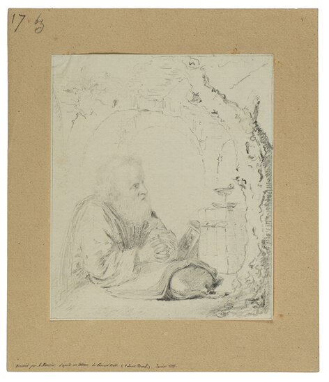 A draughtsman and engraver of the Ecole genevoise, Abraham Bouvier made his mark on the art scene of his time by engraving a number of portraits of personalities from Geneva. He also enjoyed engraving copies of Old Masters and Swiss artists of his time, such as Firmin Massot. He taught drawing at the Collège de Genève and was a member of the Société des Arts de Genève, which preserves several of his works. An inscription in black ink on the lower left corner of the paper on which the drawing is fixed provides us with several pieces of information: the present drawing, made by Abraham Bouvier probably in January 1825, is a copy of a work by the Dutch master Gérard Dou (Leyde, 1613-Leyde, 1675) depicting a Hermit praying. This work, which was in the famous Duval collection at the time, has not yet be located. Moreover, the present drawing is none other than the preparatory model for the engraving made by Abraham Bouvier for the same subject, which is one of several engravings of works that belonged to François Duval (a collection of these prints is kept at the Archives d'État de la ville de Genève).