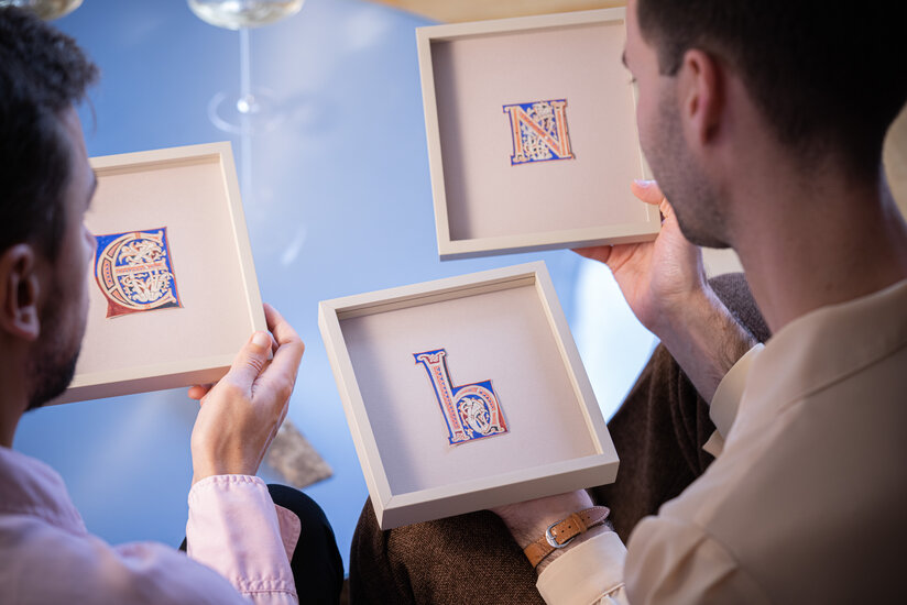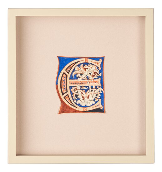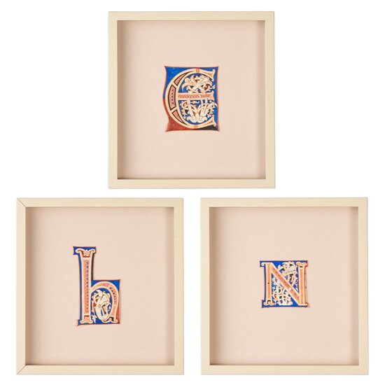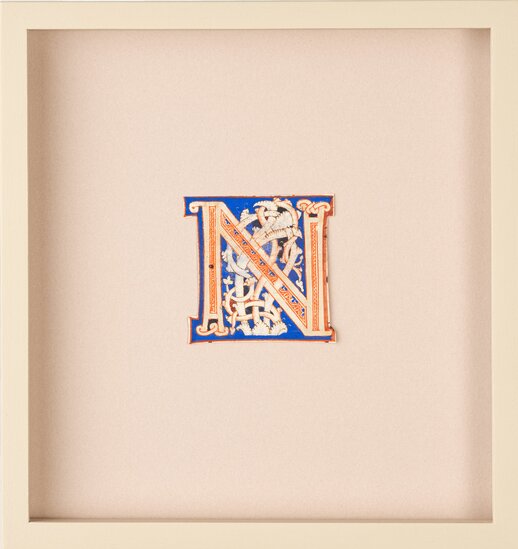 Coming from the renowned collection of Robert McCarthy and originating from a special type of Bible called 'Bibbie Atlantiche' (in reference to the mythical creature that supported the sky) or 'Atlantic Bible' (in reference to the size of the Atlantic Ocean) because of its enormous size, the three present initials "E", "H" and "N" are richly illuminated. Decorated with complex and intricate geometric patterns, their design is based on the later Geometric style, a style that refers to the ancient Greek art, particularly in pottery. Each initial is adorned with several segments of various shapes, which are themselves decorated with geometric patterns in red, blue or green. The empty space is filled with vine stems or vine stems combined with acanthus leaves that intertwine and blend with the geometric shapes that from the initial.