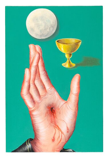 Coming straight from the artist's studio, the present painting encapsulates Harald Erath's thoughts on religion and symbolism. Removed from their original context, they invite reinterpretation. Elements like the hand with bloody hole, the poisoned chalice and the moon are free of any meanings; the viewer is free to assign his own meaning to the symbols depicted on the painting. For Harald Erath, the viewer's emotional response is always crucial, defining his art beyond his own intentions.