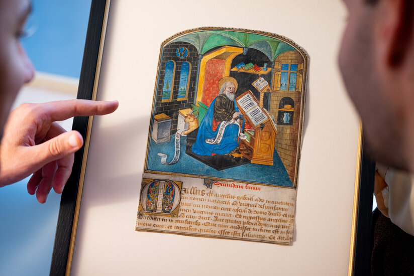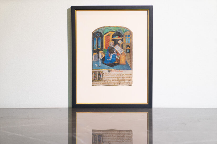 This impressive and exquisite illuminated leaf depicting Saint Luke at his desk is painted by an intriguing and rare illuminator called the Master of Foljambe. He is named after a lavish Book of Hours made c. 1455-1460 and once owned by the nobleman Francis Ferrand Foljambe (Aldwark, North Yorkshire, 1749-Osberton Hall, 1814) now in private hands. Only a few artworks have been attributed to this master, who remains mysterious: besides the Book of Hours previously in the Foljambe collection, the anonymous master is only responsible for a Book of Hours (Paris, Bibliothèque nationale de France, ms. nouv. acq. lat. 28877), an exemplar of the Fiore di Vertu (New York, Pierpont Morgan Library, ms. M. 771) and exemplar of the Vie de notre Seigneur (Oxford, Bodleian Library, ms. Douce 134), an exemplar of the Histoire ancienne jusqu'à César (Oxford, Bodleian Library, ms. Douce 353) and a miniature of Saint Mark (Philadelphia Free Library, ms. E M 10:6). Based on stylistic analysis, the Master of Foljambe was mainly active in Dauphiné (France), probably in Grenoble. However, the artist shows stylistic similarities with manuscripts made in Lyons or Geneva.